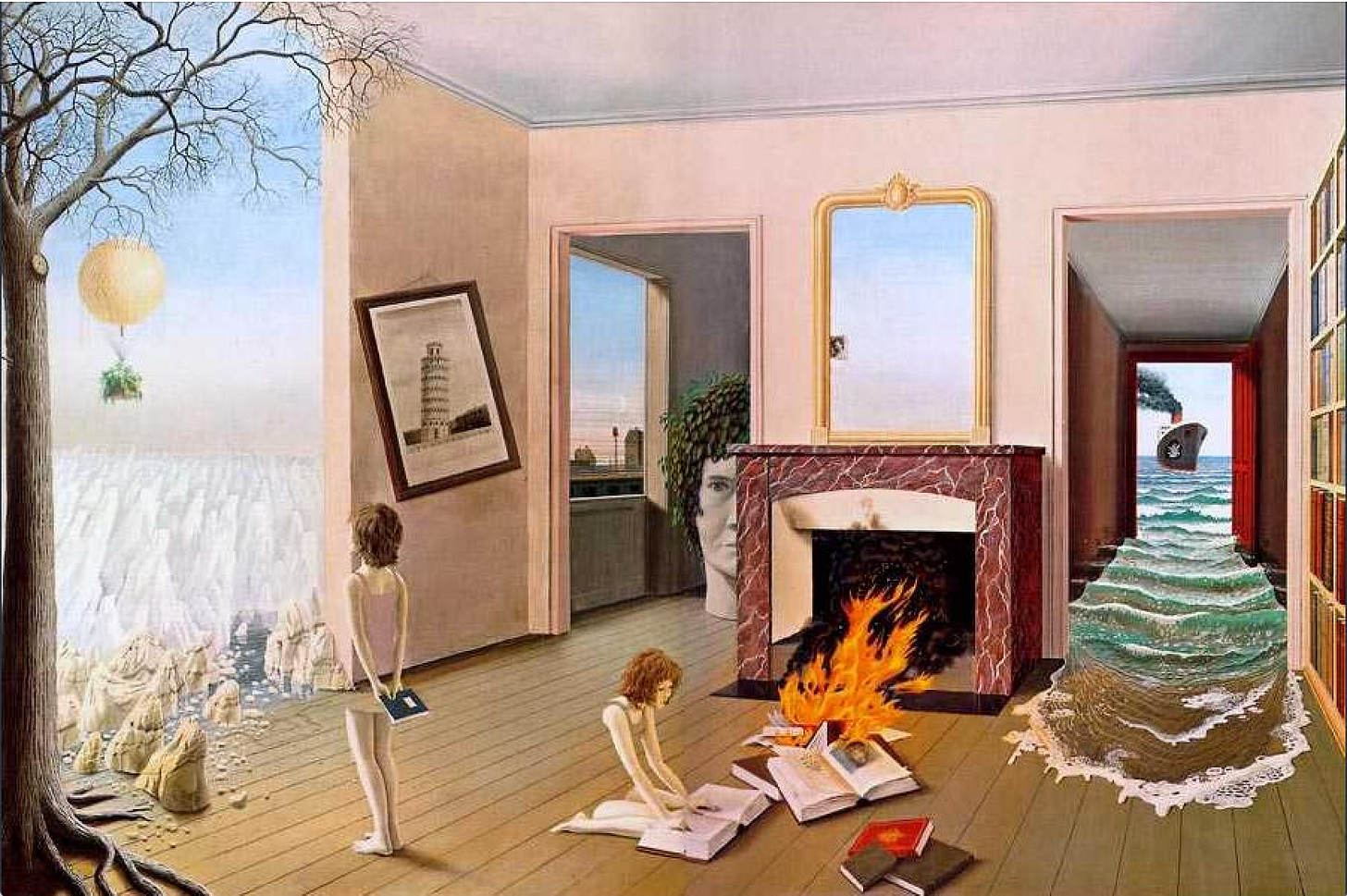 Look at the black smoke of industry barreling towards their already fractured home, and the creepy watching chia pet of some dumb authority menacing these disappearing kidartists. Half here, half not. Are they becoming invisible because they’re forgetting themselves? Or are they saving themselves from total erasure by burning a history that never included them? Outside: just winter, and the maybe-hope of a ballooned escape, lots of death, a little whimsy.